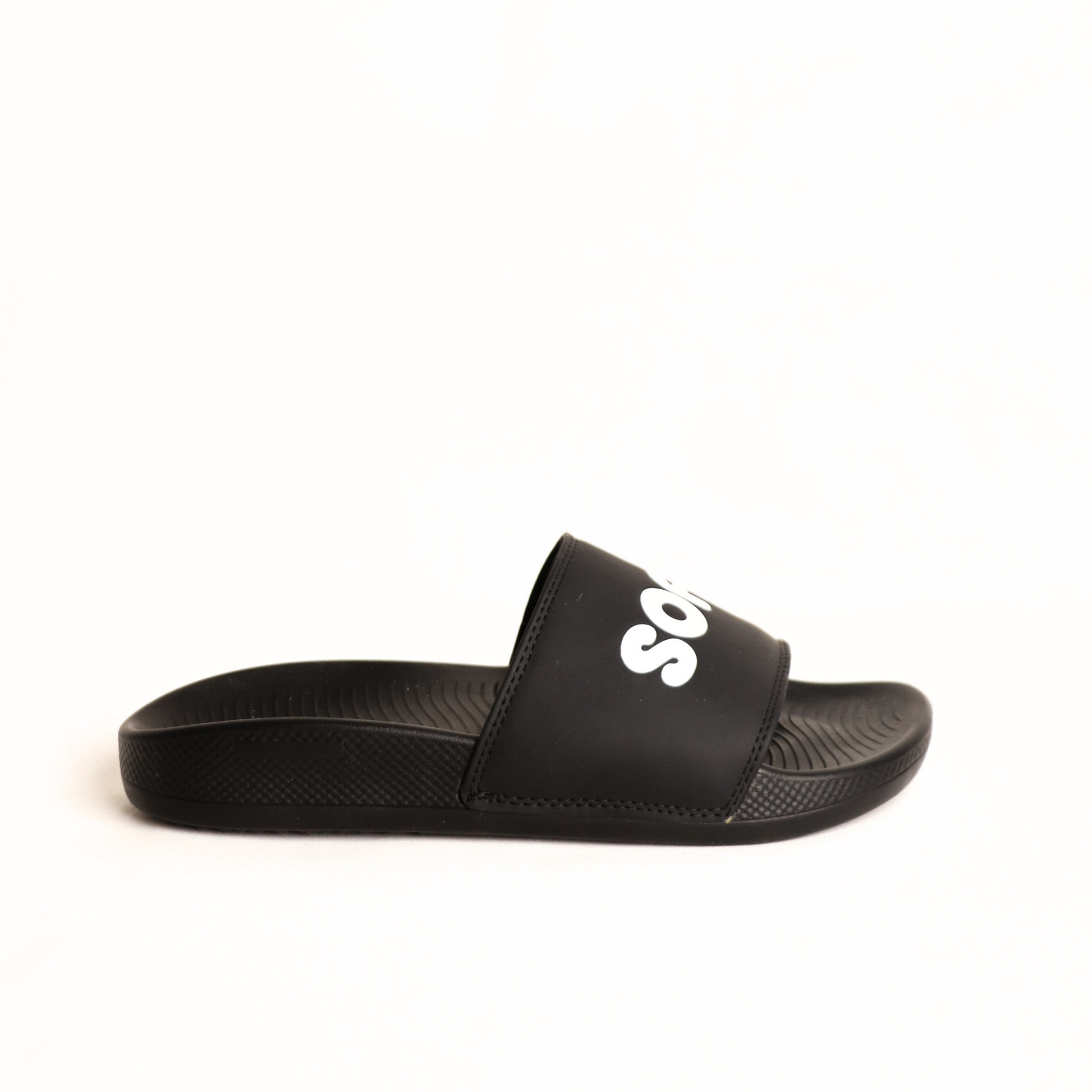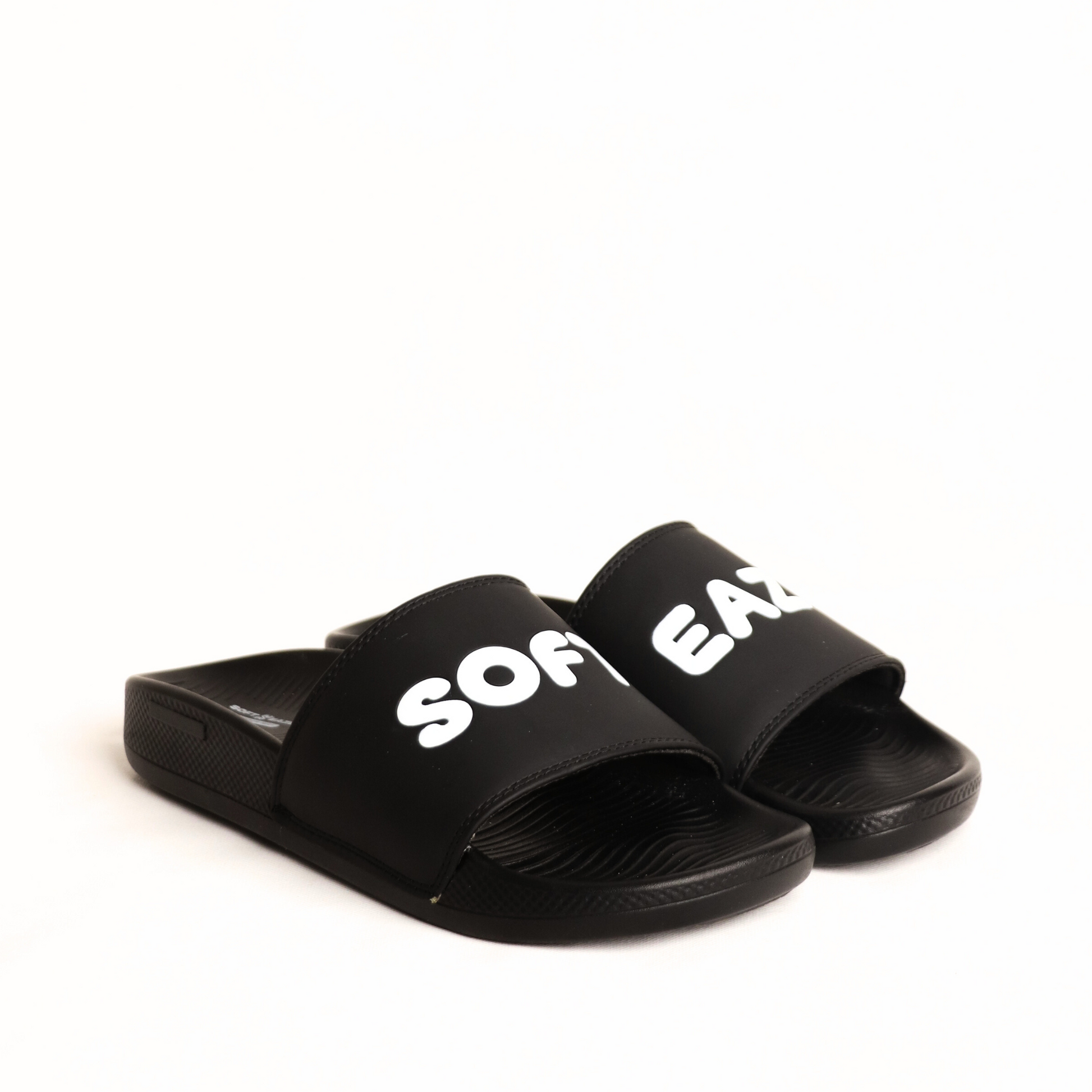 The essential choice for everyday comfort and classic style, the Soft Eaze Onyx Original slides feature a bold black base with prominent white "SOFT EAZE" branding.