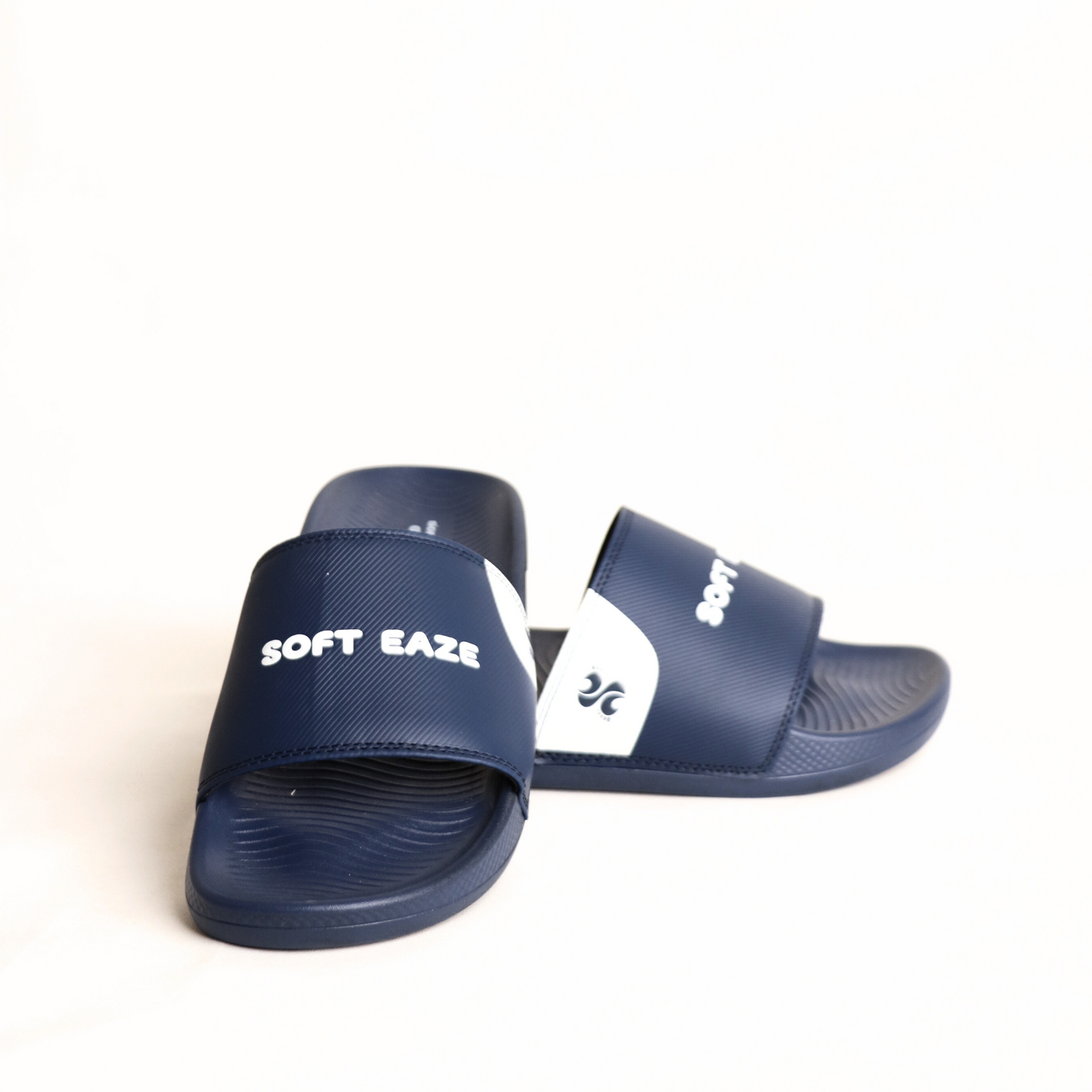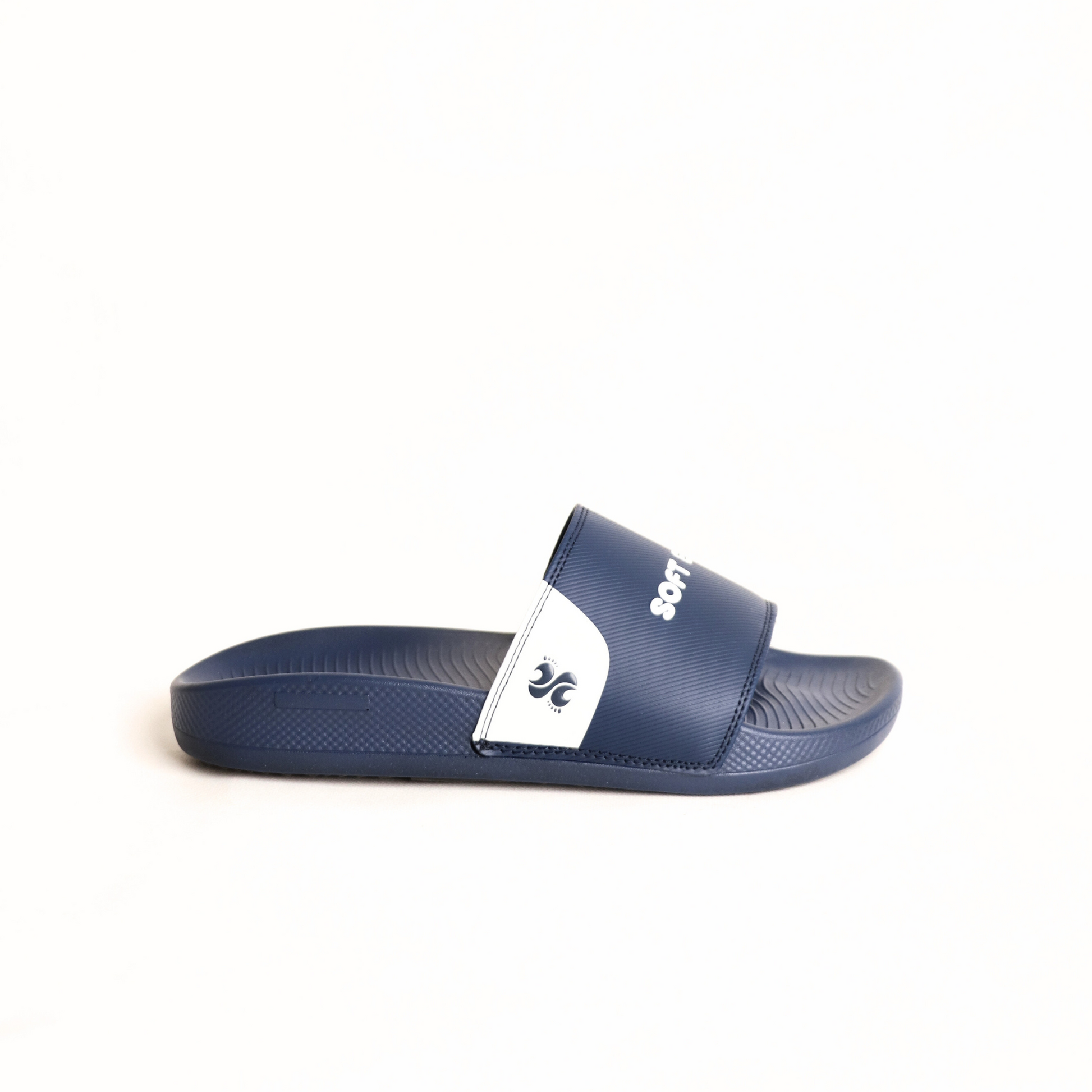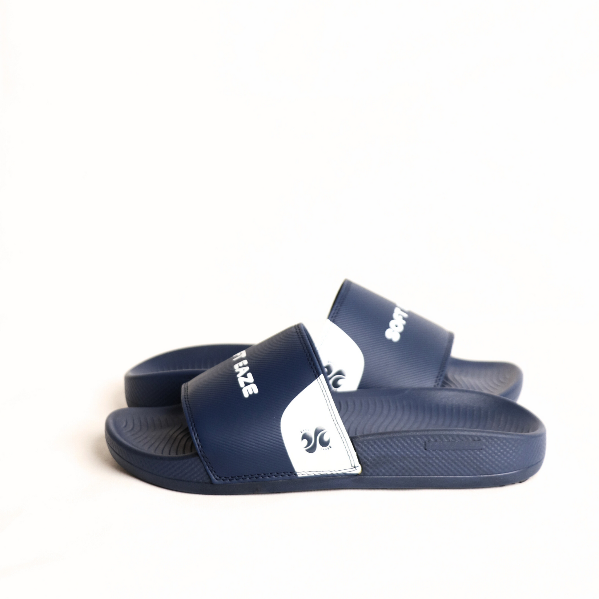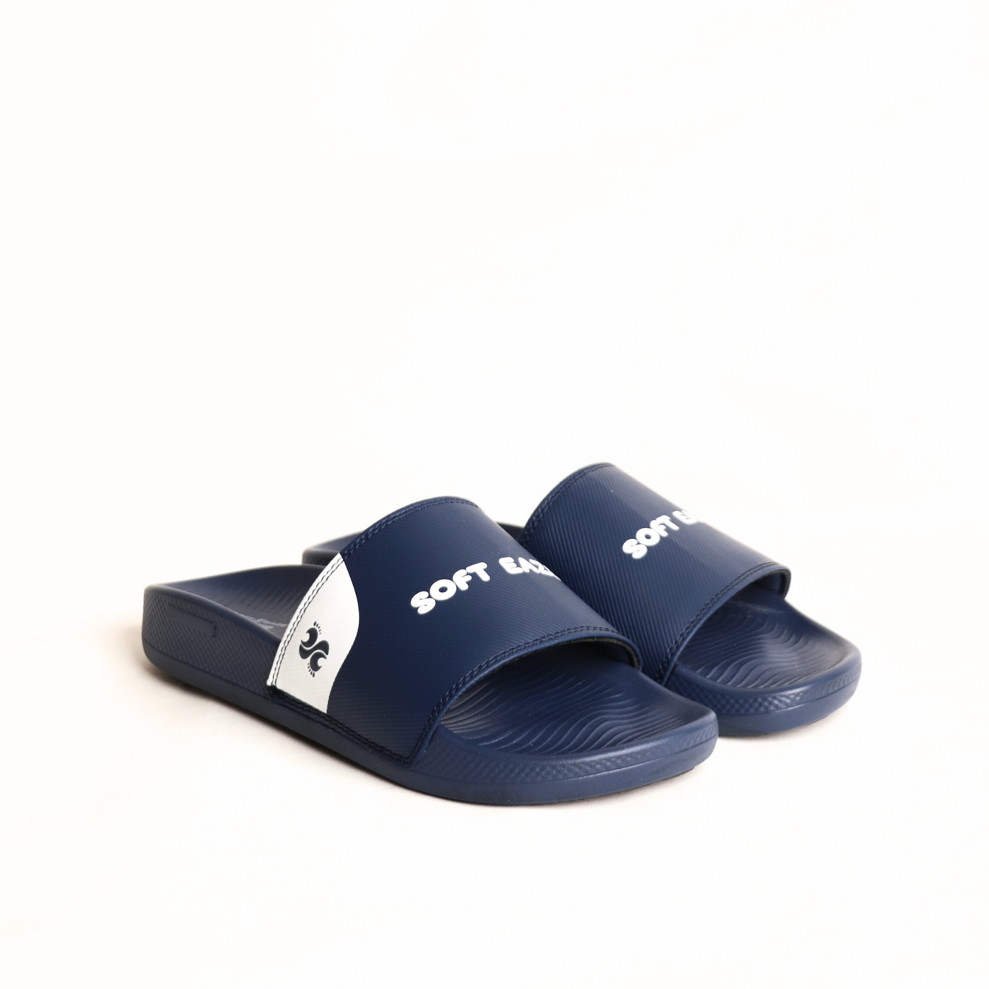 Gaze into ultimate comfort with our Soft Eaze Ocean Vista slides. These deep navy blue slides feature a striking white accent design on the strap, adding a touch of oceanic flair.