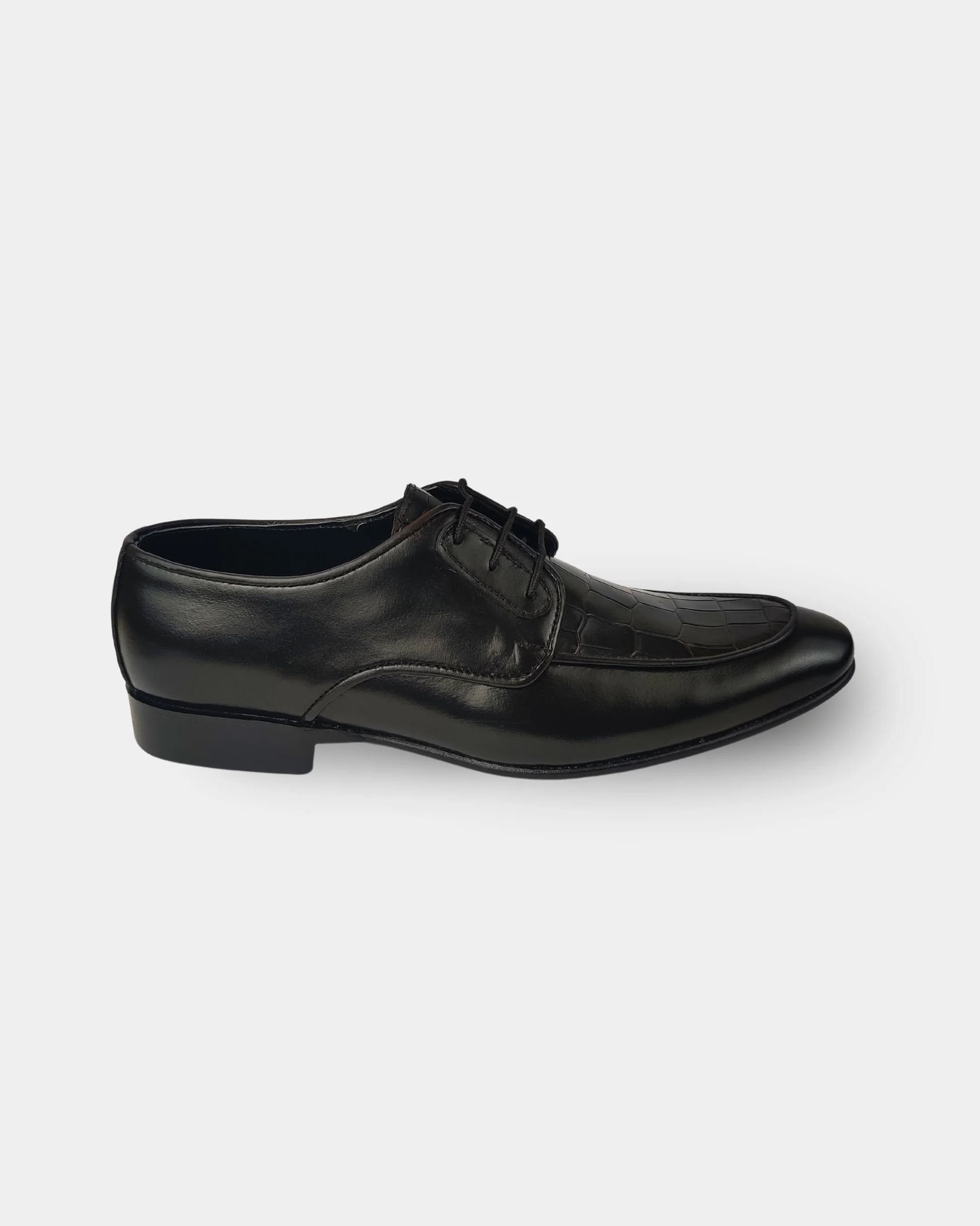 Step into style with Gator, our black formal shoes featuring a crocodile skin texture. These shoes offer a luxurious look that's perfect for any formal setting.