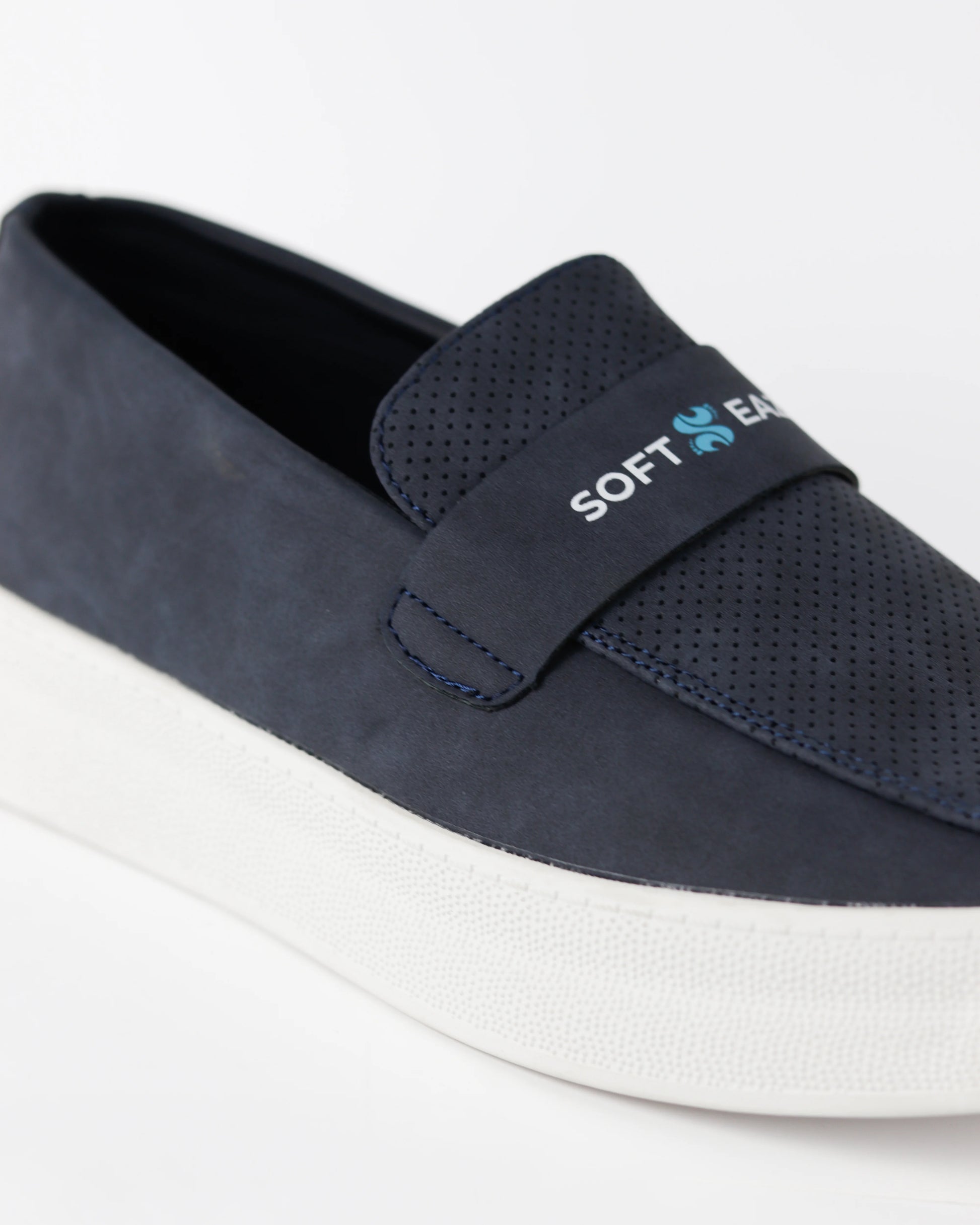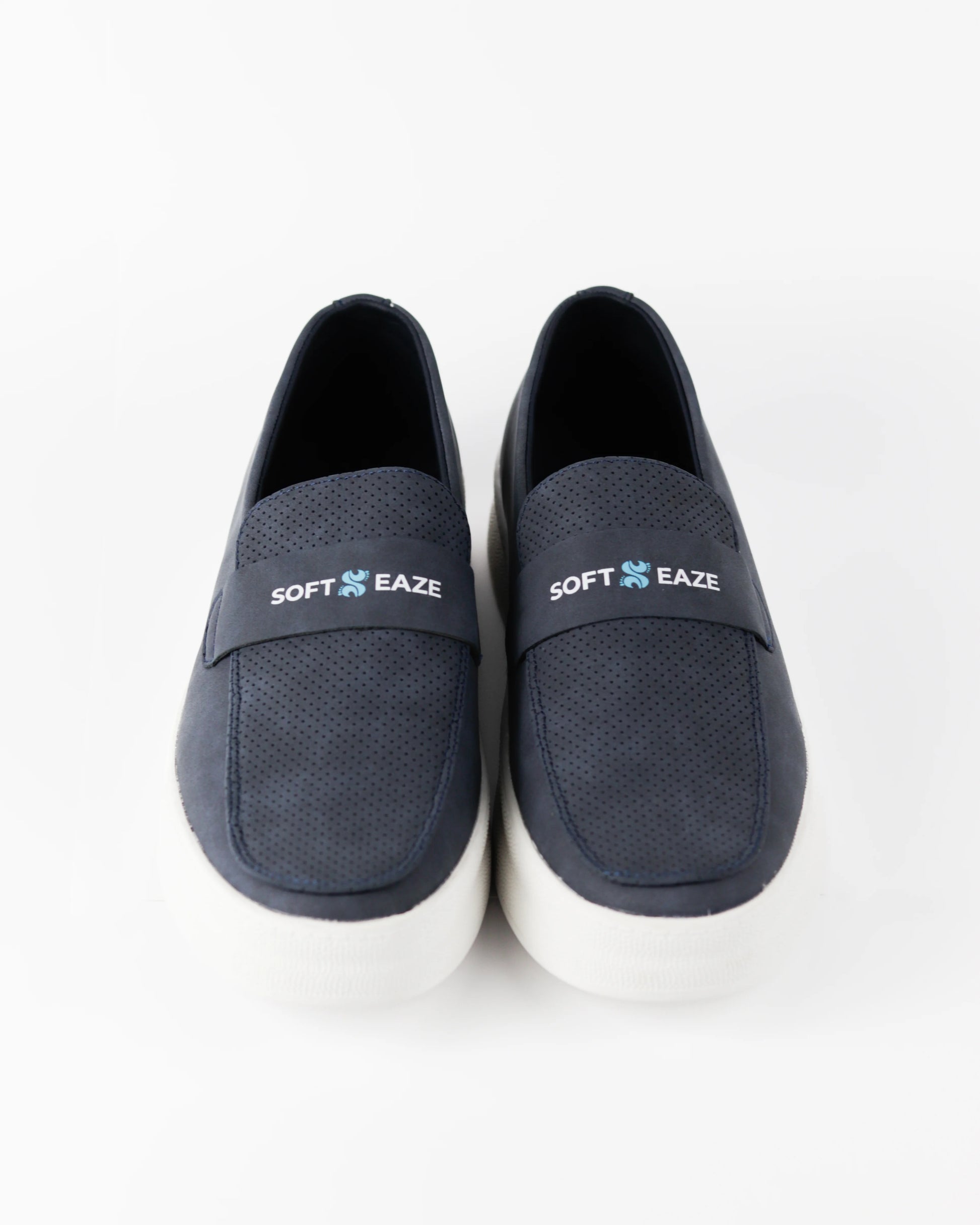Explore our blue loafers, featuring a fresh white sole and the Softeaze logo on top. These loafers bring a stylish touch to any outfit, with the vibrant blue color offering a bold look and the white sole adding a modern twist.