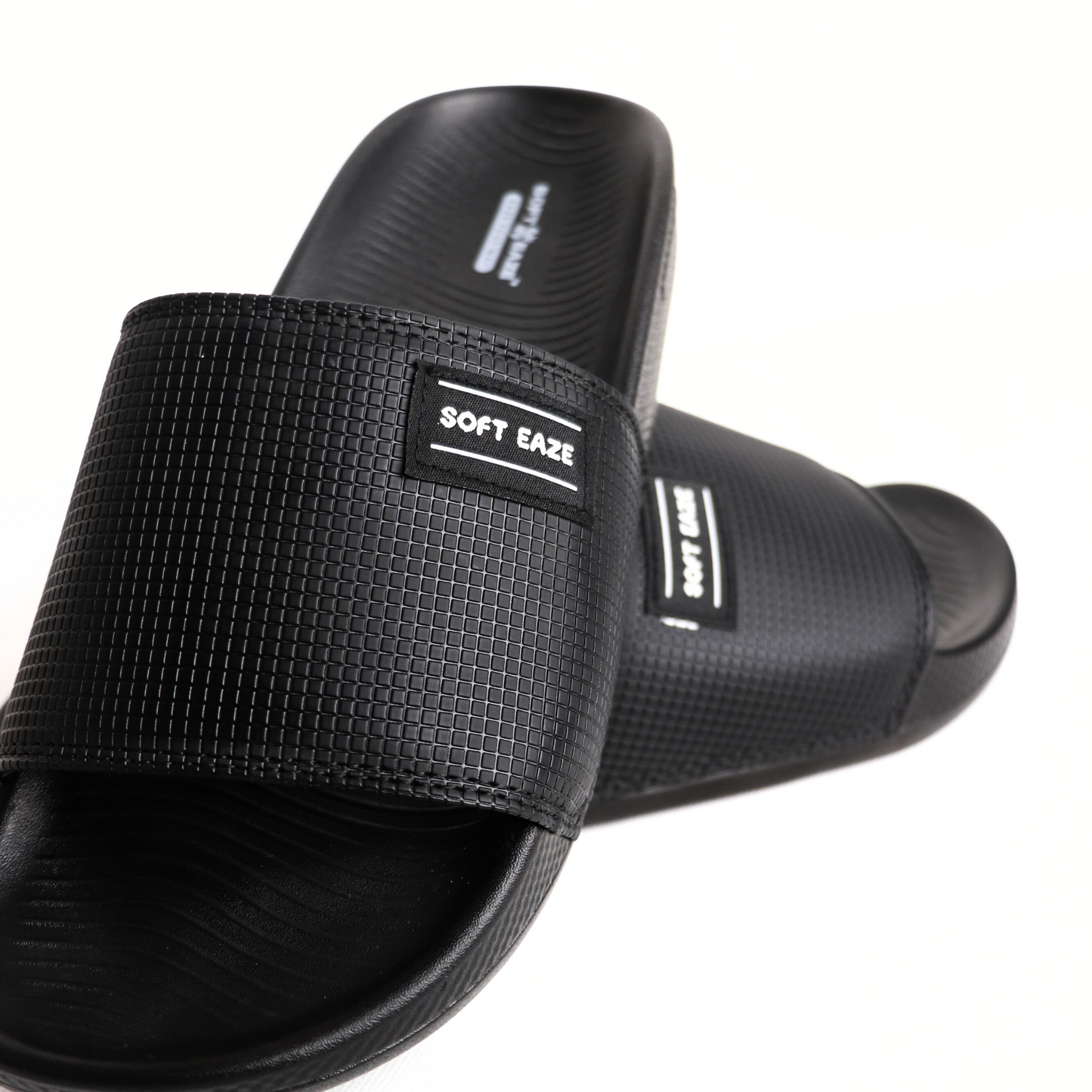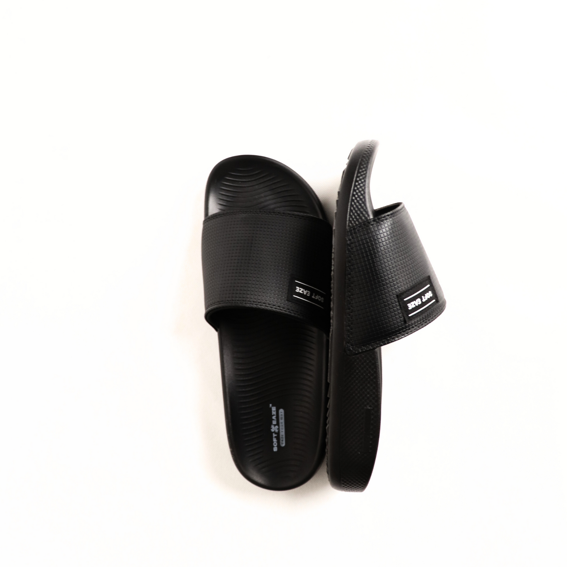 Slide into all-day comfort with the Softeaze Drift™ — your everyday essential. Designed in deep black with a minimalist patch bearing our mark, these slides combine ease, style, and durability.